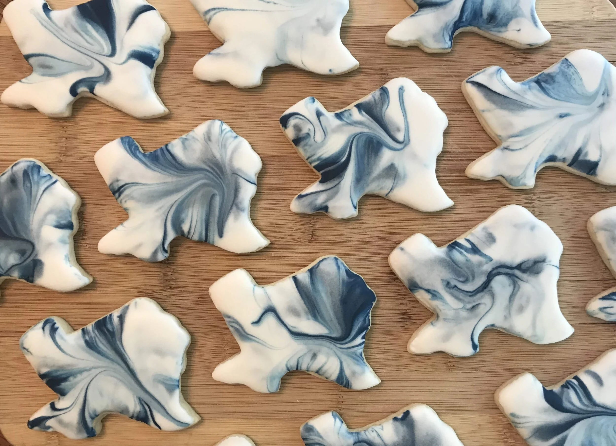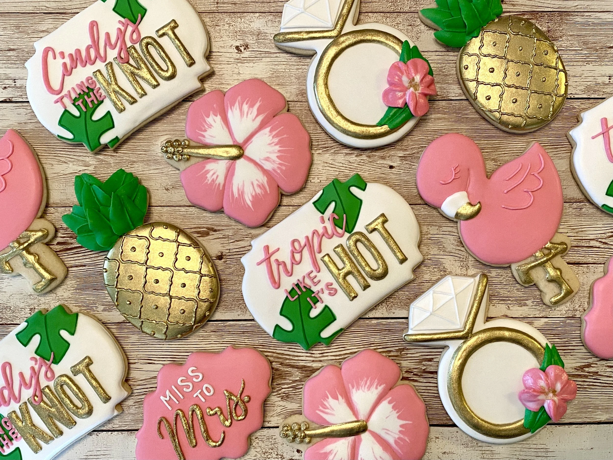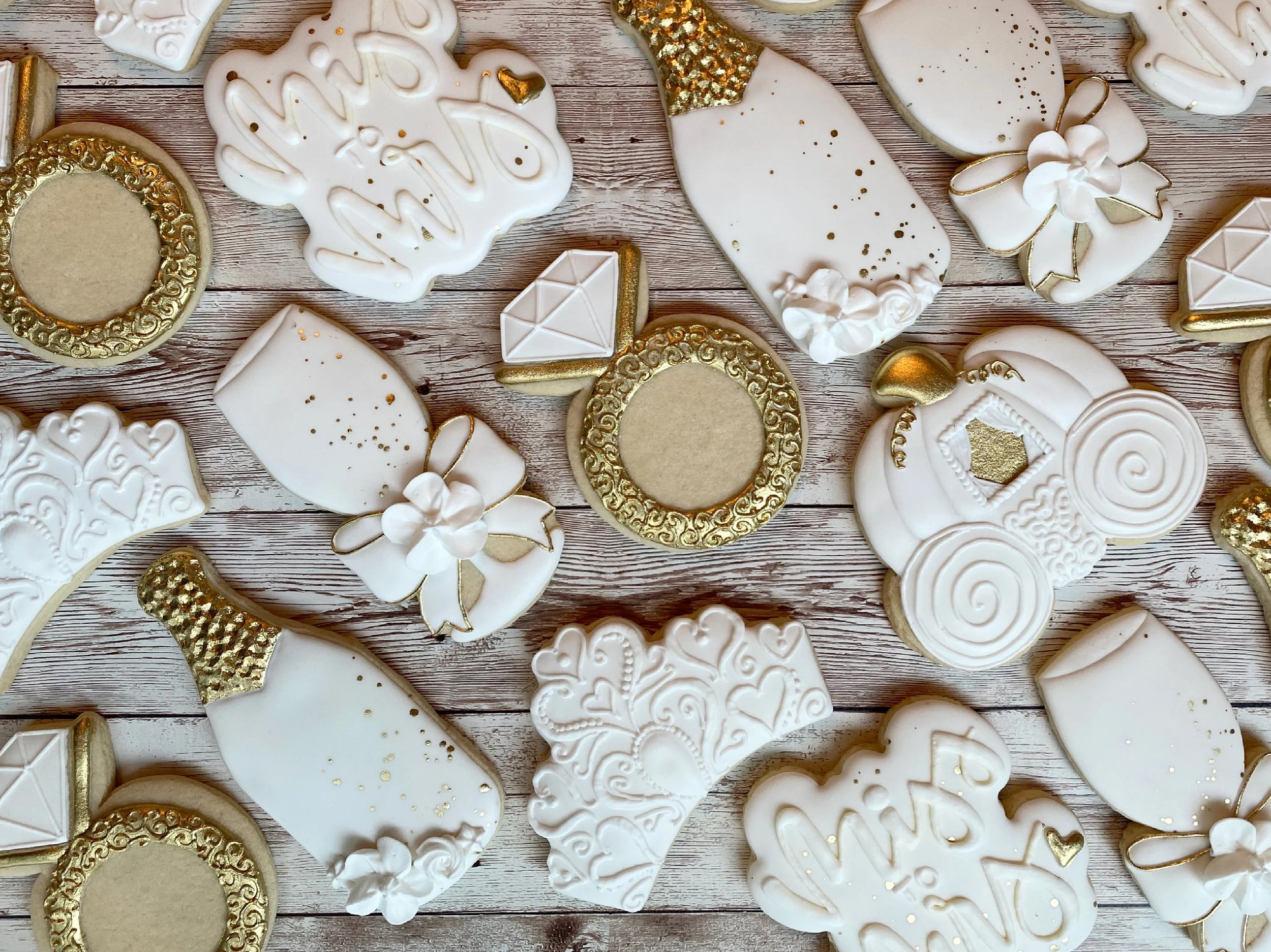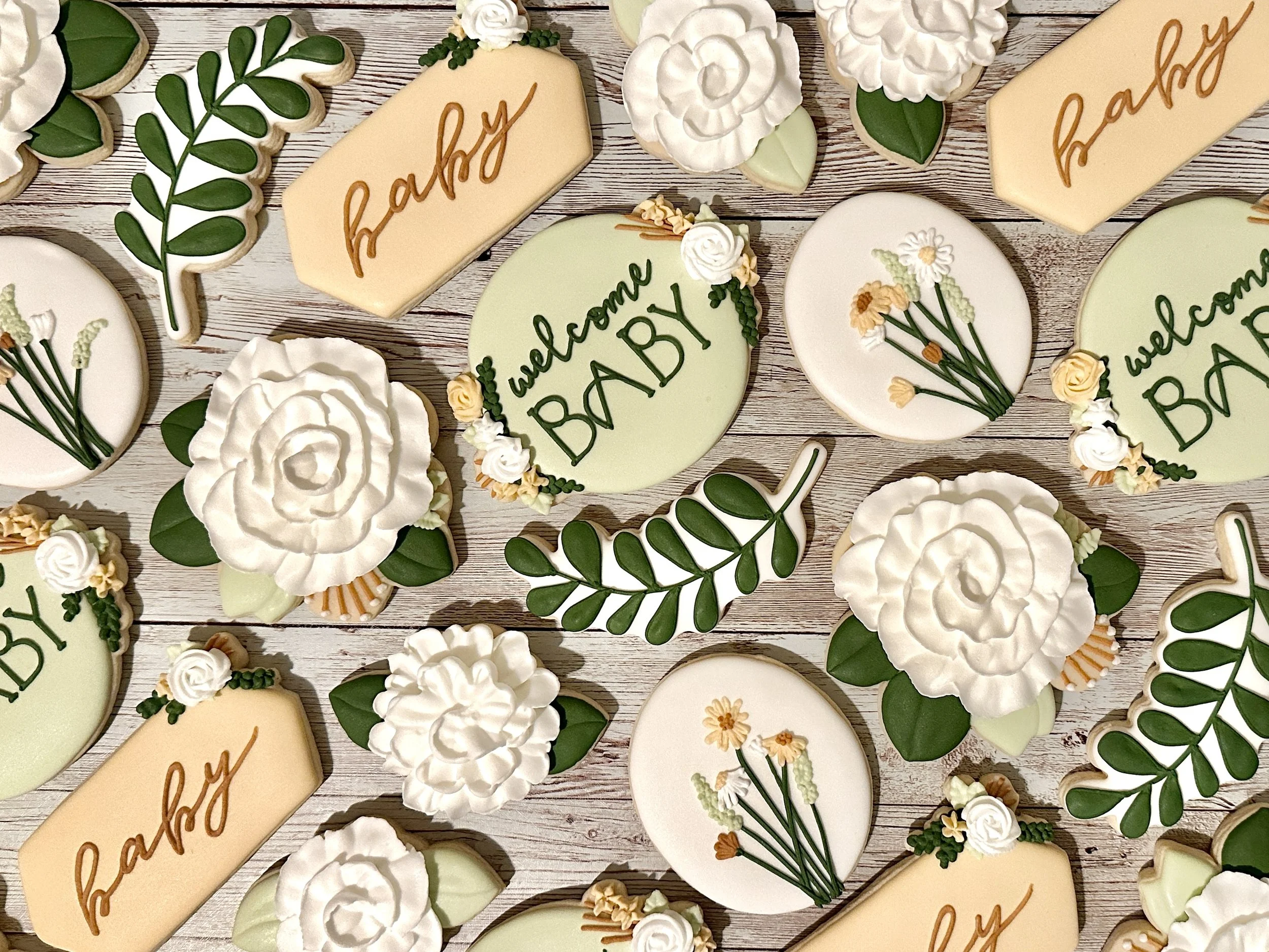 Cookies start at $50/dozen. Extra charges will be applied to cookie sets that are very intricate, require stencil work, or use more than four colors, as well as sets with gold, silver, or rose gold details. Extra charges will also be applied to orders requesting that cookies be individually wrapped.